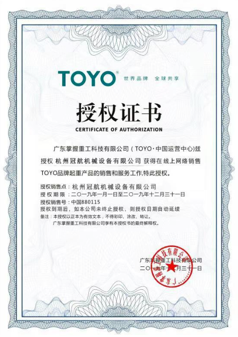 杭州冠航機械設備有限公司為TOYO中國運營中心授權的線上網絡銷售商。